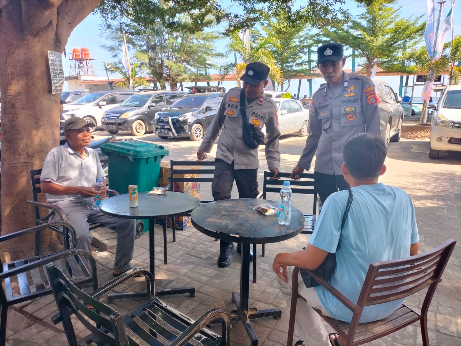 Anggota jaga Polsek Pemenang melaksanakan patroli dialogis di kawasan Pelabuhan Bangsal, Kecamatan Pemenang, Kabupaten Lombok Utara, Kamis (04/09/2025).