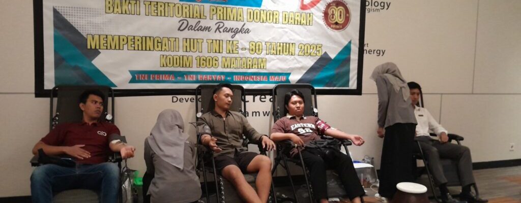 Mataram, NTB – Suasana hangat dan penuh kepedulian sosial mewarnai kegiatan Bakti Teritorial Prima Donor Darah dalam rangka memperingati Hari Ulang Tahun (HUT) ke-80 Tentara Nasional Indonesia (TNI), Selasa (30/9/2025).