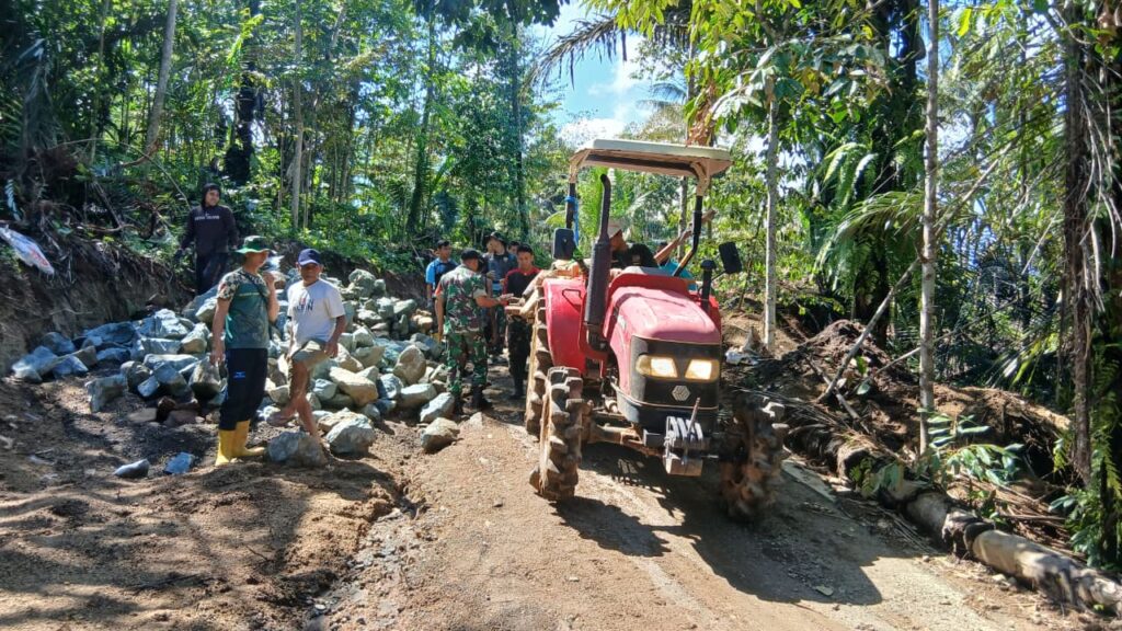Yang menarik, proses pengangkutan material kali ini dilakukan menggunakan traktor yang dimodifikasi menjadi alat angkut sederhana, hasil kreativitas warga setempat. Alat ini menjadi solusi efektif untuk mempercepat pendistribusian material ke titik sasaran yang medannya cukup menantang.