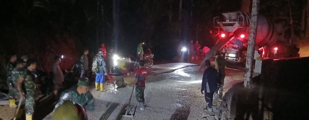 Lombok Barat, NTB – Hujan deras yang mengguyur Desa Giri Madia, Kecamatan Lingsar, Lombok Barat, tak menyurutkan semangat personel Satuan Tugas (Satgas) dan warga untuk menuntaskan pengecoran jalan dalam program TNI Manunggal Membangun Desa (TMMD) ke-126 Komando Distrik Militer (Kodim) 1606 Mataram, Rabu malam (29/10/2025).