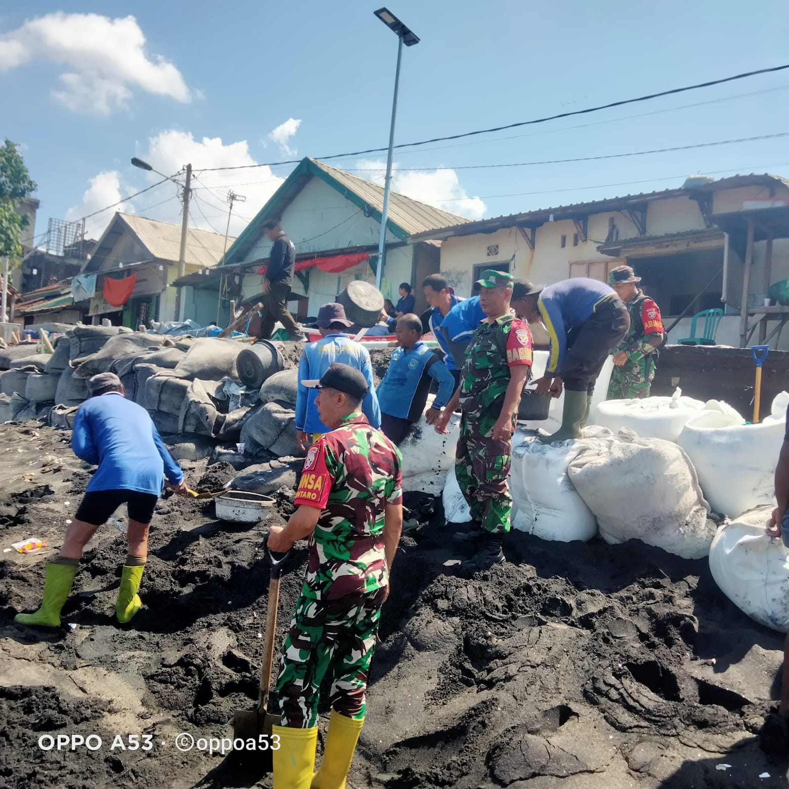 Bintara Pembina Desa (Babinsa) Kelurahan Bintaro, Komando Rayon Militer (Koramil) 1606-09/Ampenan bersama masyarakat dan pihak terkait bahu-membahu melakukan pengisian pasir Geobag sebagai penahan gelombang sekaligus penimbunan jalan yang rusak akibat abrasi beberapa hari lalu.