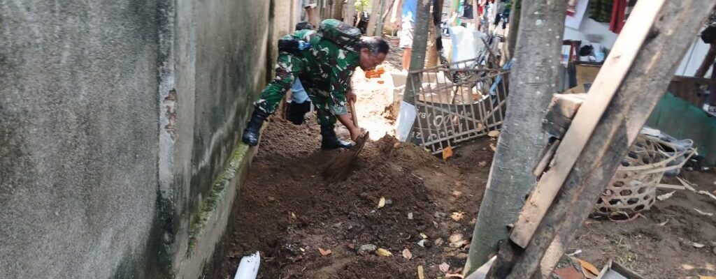 Dalam suasana penuh semangat kebersamaan, Babinsa bersama warga tampak bahu-membahu membersihkan dan memperbaiki saluran air yang tersumbat akibat endapan lumpur serta sampah rumah tangga. Tak hanya memberi arahan, Serka Agus turut turun langsung ke parit sempit di antara rumah warga, mengangkat tanah, dan membantu proses pemasangan batu bata saluran air.