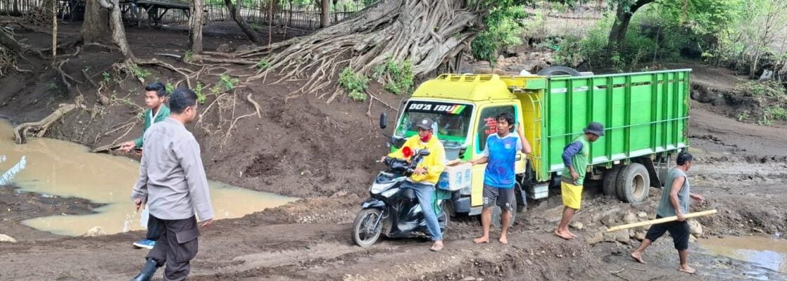 Tidak saja melakukan pengaturan arus lalulintas petugas juga membantu mendorong SPM pemotor yang terjebak Lumpur.