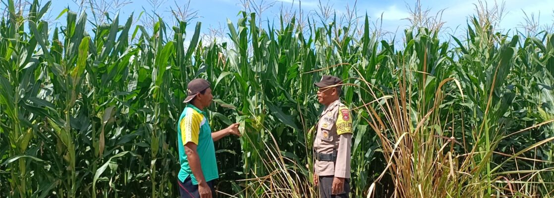 Bhabinkamtibmas melakukan sambang sambil memantau kondisi tanaman jagung yang saat ini baru berumur 3 bulan. Pemantauan ini bertujuan memastikan pertumbuhan tanaman berjalan baik dan terhindar dari hama, sehingga potensi hasil panen yang maksimal dapat tercapai. Selain pemantauan, Bhabinkamtibmas juga berinteraksi dengan petani, memberikan semangat serta imbauan agar selalu menjaga keamanan lahan pertanian.