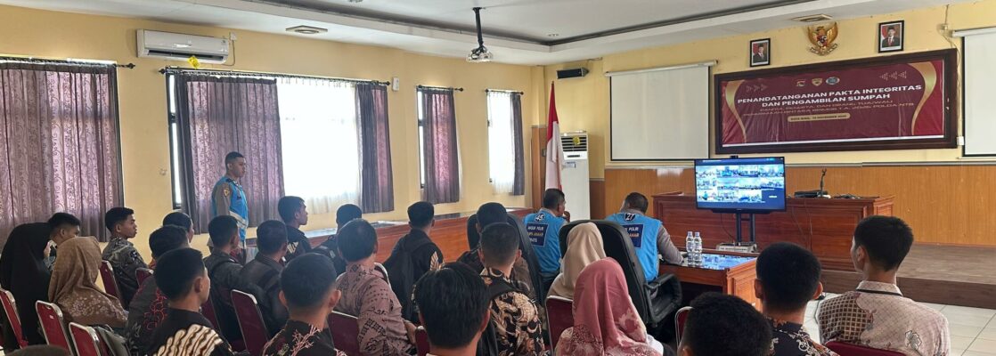 Kota Bima, NTB (19 November 2025) – Bag SDM Polres Bima Kota menggelar kegiatan Penandatanganan Pakta Integritas dan Pengambilan Sumpah Panitia, Peserta, serta Orang Tua/Wali Penerimaan Bintara Brimob T.A. 2026 Polda Nusa Tenggara Barat. Kegiatan ini berlangsung pada Rabu (19/11/2025) pukul 09.00 Wita di Aula Rupatama Polres Bima Kota dan diikuti secara virtual melalui Zoom yang dipimpin langsung oleh Kapolda NTB, Irjen Pol Hadi Gunawan, S.H., S.I.K., beserta para Pejabat Utama Polda NTB.