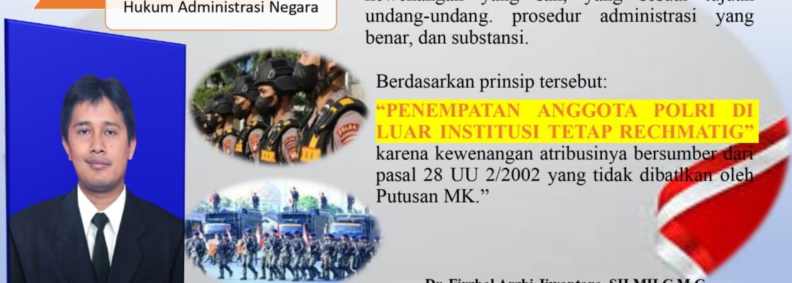 “Dalam Hukum Administrasi Negara, legalitas suatu tindakan pemerintahan ditentukan oleh tiga unsur utama: kewenangan yang sah, prosedur administratif yang benar, dan substansi yang sesuai tujuan undang-undang. Berdasarkan prinsip tersebut, penempatan anggota Polri di luar institusi tetap rechtmatig, karena kewenangan atribusinya bersumber dari Pasal 28 UU 2/2002 yang tidak dibatalkan oleh Putusan MK.”